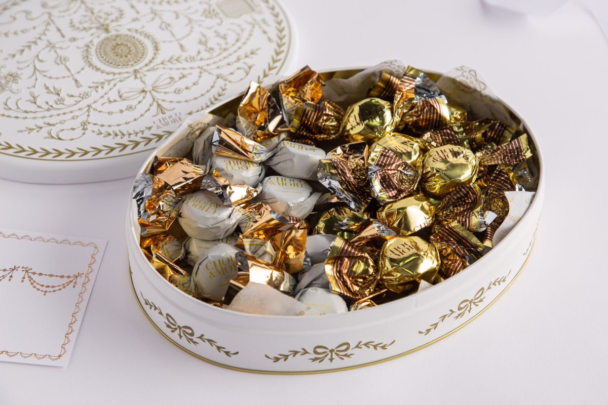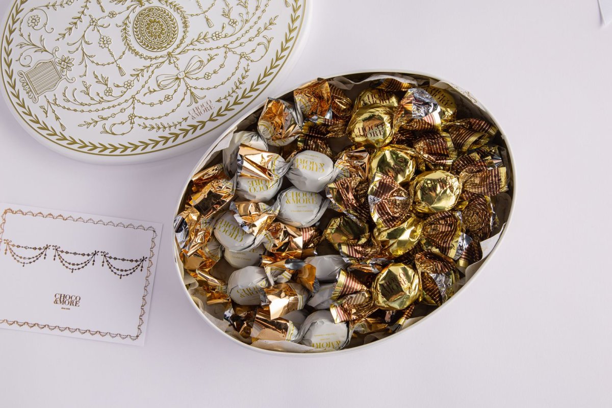 2-كاكاو مغلف متنوع -علبه معدنيه كلاسيك ابيض مع ذهبي