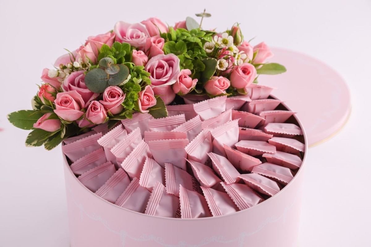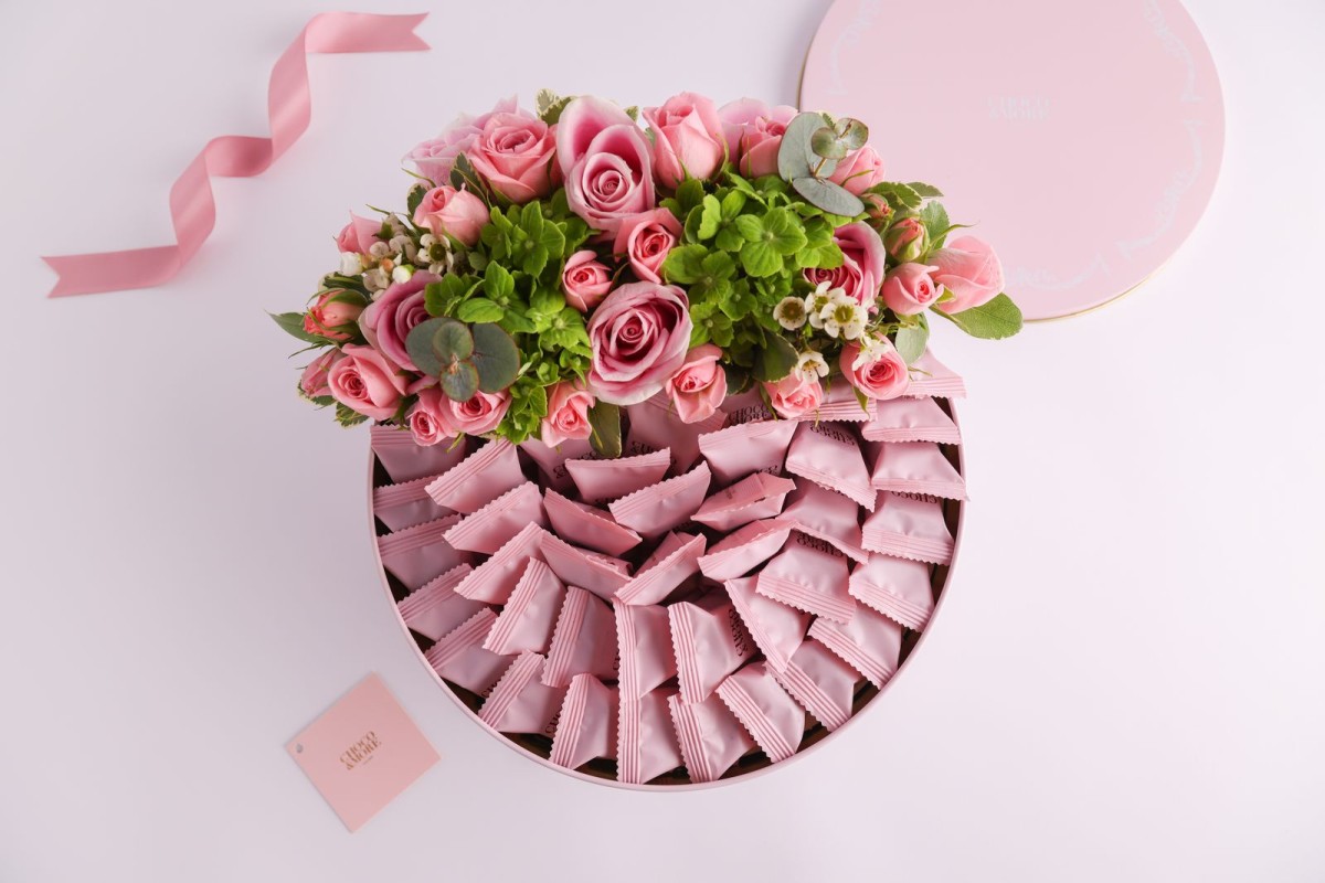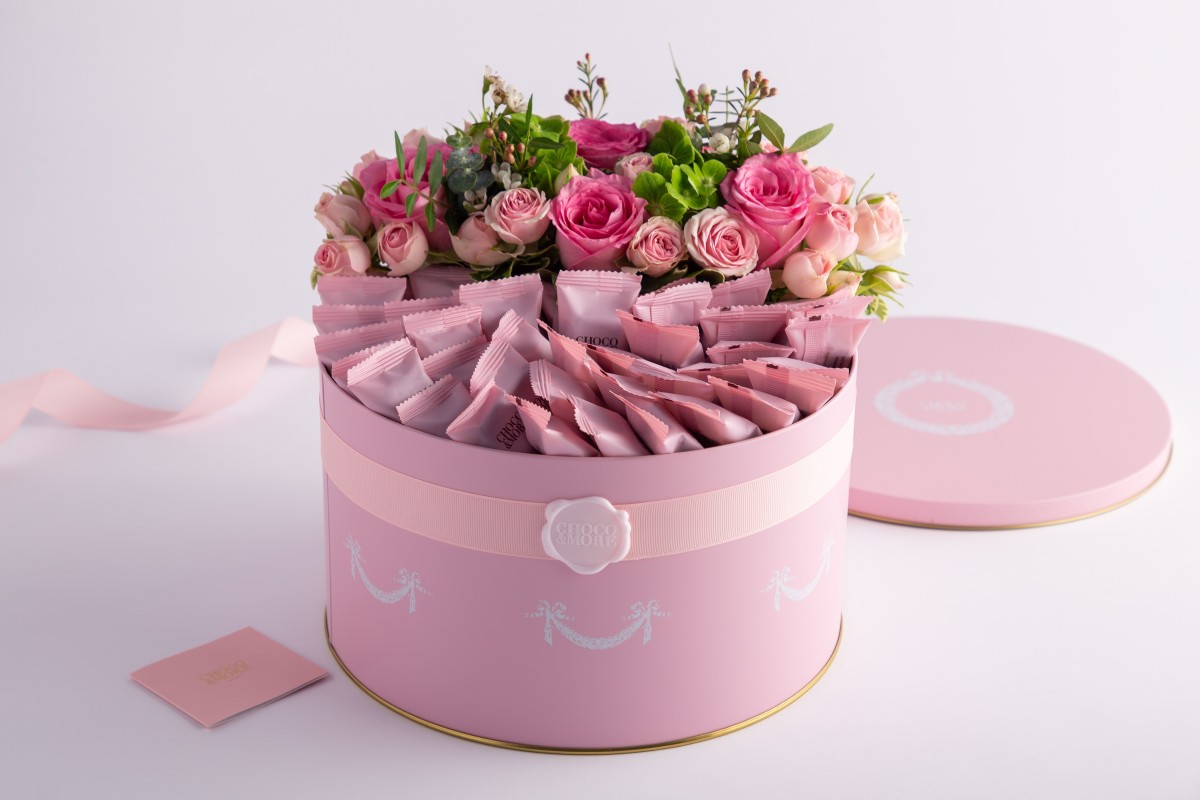 علبه كاكاو معدنيه باللون الوردي مع ورد طبيعي